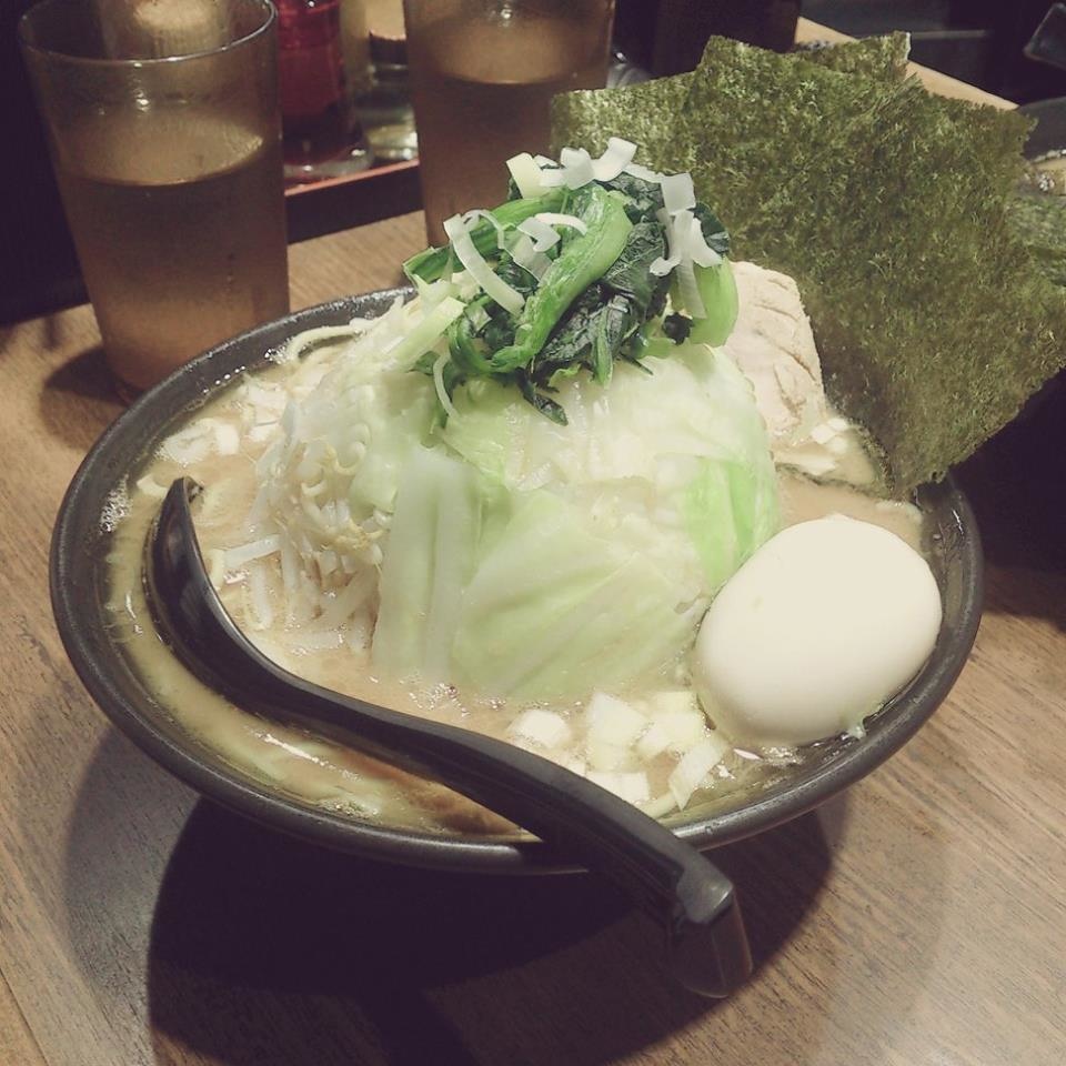這是我第一次吃家系拉麵,份量比前幾天吃到的都多啊好驚人,蔬菜拉麵擺了一大球的高麗菜加豆芽菜幾乎要滿溢而出,湯頭喝起來像是在吸肉汁一般濃郁美味,這家拉麵至今仍令人念念不忘,真可惜目黑站太遠上次沒空再訪...
