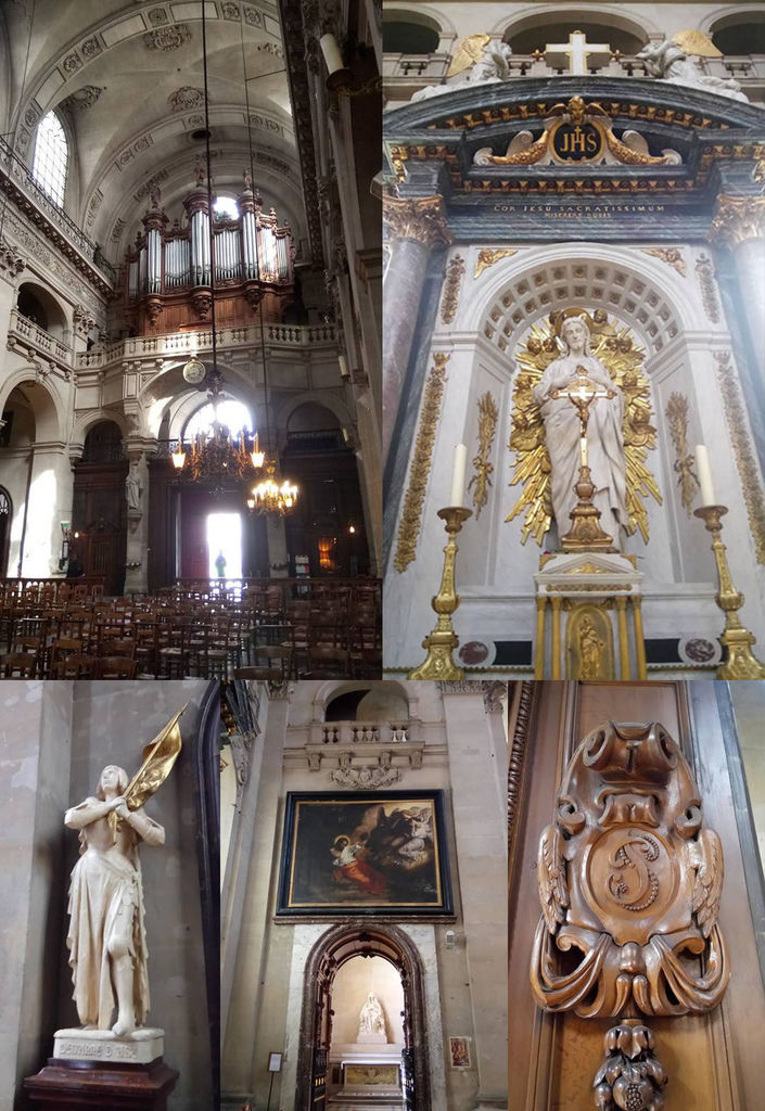 發現巨大管風琴坐落在入口上方,還滿喜歡聽管風琴演奏的,不過可遇不可求。這教堂也有貞德像,金色的旗子好搭。