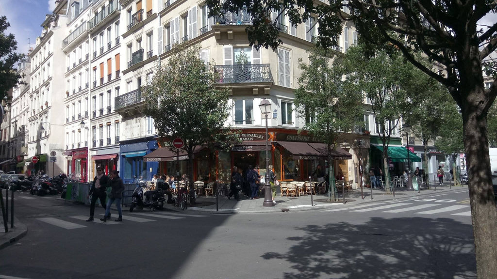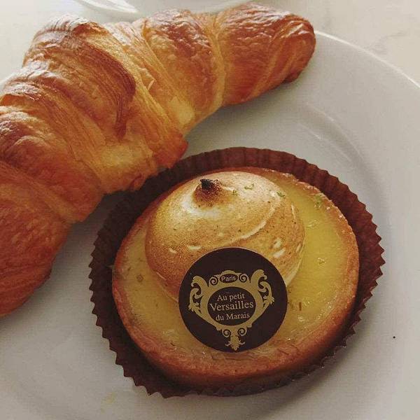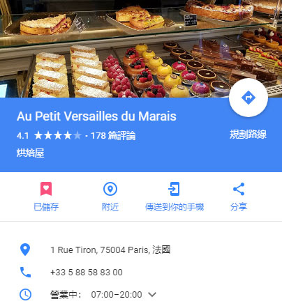 接著來到朋友強力推薦的甜點店,Au Petit Versailles du Marais 瑪黑小凡爾賽 (亂翻的),坐落在三角窗的愜意空間,外面座位半滿、裡面幾乎全滿。因為外面會有人抽菸所以我們選裡面座位,剛好點完餐就有空出很幸運。