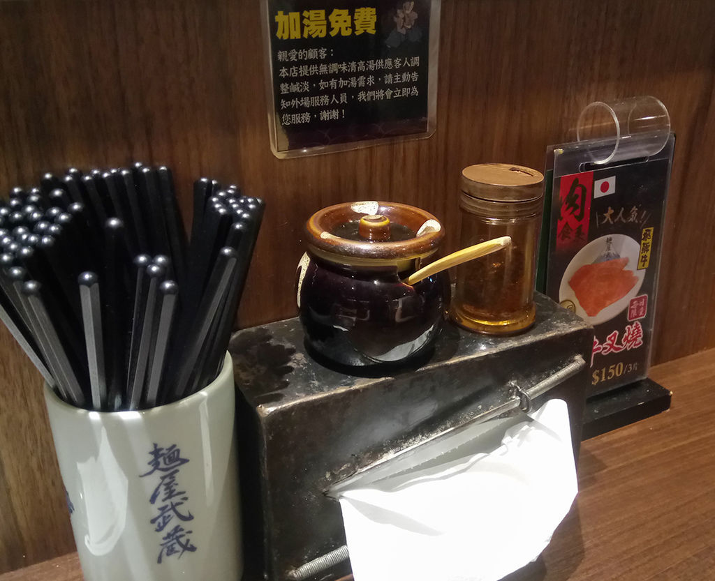 吧檯桌上有麵屋武藏訂製款的筷杯跟面紙盒,面紙盒上面是兩把長長的日本刀裝飾很有巧思,充滿男子氣概的擺設。上面的瓶子裝的是醃漬蒜頭,味道滿重的若喜歡蒜味的人可以嘗試看看,旁邊小罐應是辣椒粉。