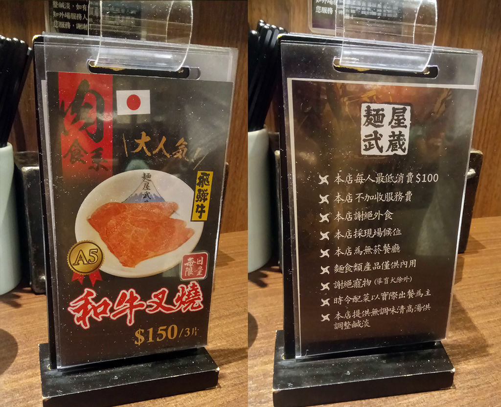第二頁有一些基本用餐規則,每人低消$100而不是一碗拉麵還滿貼心(大部分拉麵店會希望是一人點一碗),如此一來有帶小朋友的客人就可以點配菜或飲料一起吃,不須擔心小朋友吃不完。