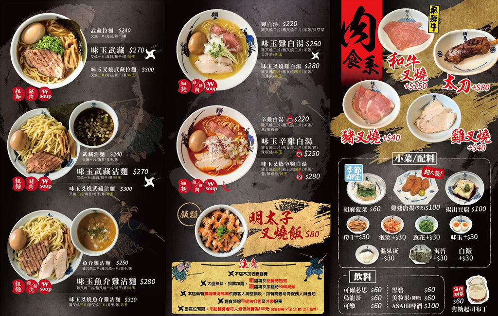 門口看板寫著東京最強武士魂拉麵十分霸氣,照片看起來也滿美味的,價位算是中高,220~310的都有,若再加點小菜或配料不算便宜,還好不收服務費。