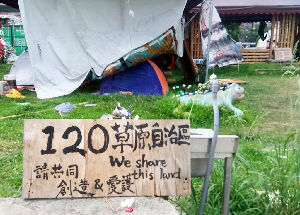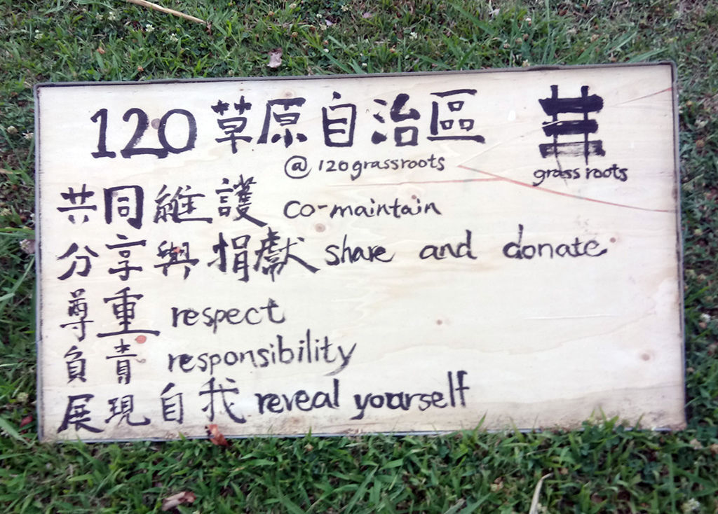 120草原自治區的告示牌大大的擺在草地上,但看了也不確定到底是怎樣的地方或活動。