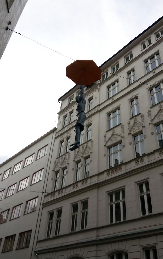 雕像一共有兩個,一男一女,都撐著傘掛在建築間,隨風會轉動很有意思。