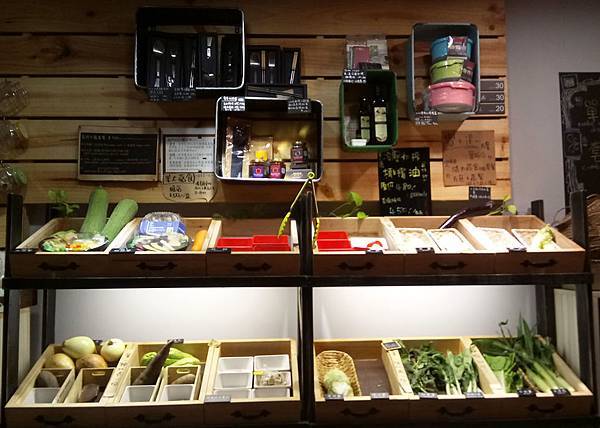 菜架上方還陳列了些環保餐具跟有機商品,若自備便當盒來外帶似乎也不錯。右手邊是餐具架跟回收區,沒拍到。