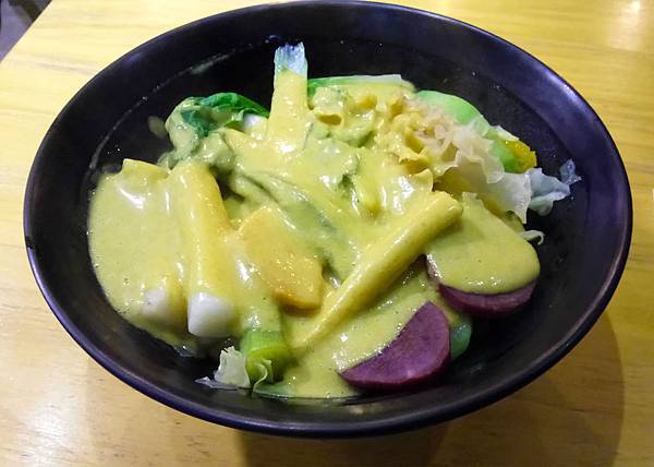 今天吃的是咖哩口味的蔬福餐配年糕,拍照起來有點看不出個所以然。除了葉菜類記得還有絲瓜、紫地瓜、玉米筍、白木耳(應該是),口感都滿清爽新鮮。本來想吃蔬菜麵結果已賣完,想說試試年糕也滿有趣,年糕也意外的好吃。咖哩口味跟想像中的不太一樣,椰汁跟堅果味很重,稍微甜甜沙沙的口感配上薑味十足的咖哩醬。個人偏好的是香料很多的咖哩,這清淡的口味配蔬菜也不錯就是了,不過下次想試試麻辣口味,當時看隔壁桌客人吃好像滿精彩的,應該很適合搭年糕。套餐份量不算特別多就是了,後來會餓得比較快,不小心又會吃了消夜(遮臉)。