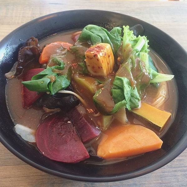 麻辣湯頭我還滿喜歡的,不是很刺激那種辣,但會增添香味,配黑木耳跟豆腐特別好吃。原本的麻辣湯說是有加蒜的,後來為了吃純素的客人拿掉,不過在餐具桌那邊還是有蒜可以加囉。