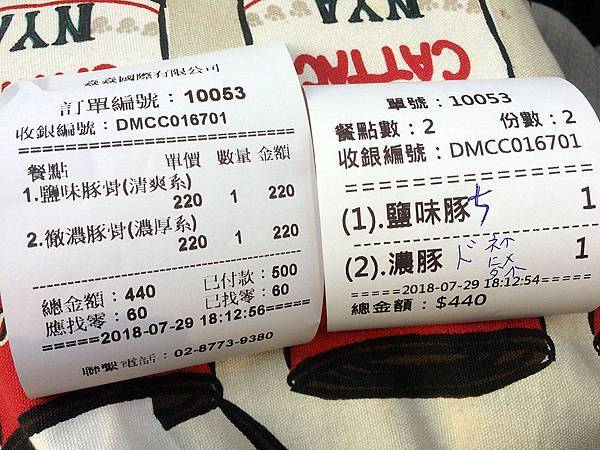 點餐機會有店員協助,我們點了徹濃豚骨跟清爽鹽味拉麵,餐券出來後店員會詢問要選的麵條跟湯頭濃淡等細節並記在餐券上。