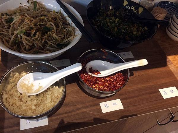 配菜有豆芽、生薑、辣椒跟比較少見的雪裡紅。
