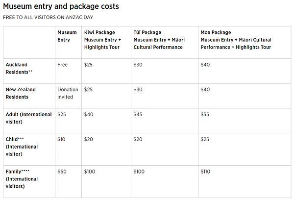 奧克蘭居民免門票,外國旅客成人$25 (約525台幣)、6-14歲兒童$10 (約210台幣),5歲以下幼童免費。