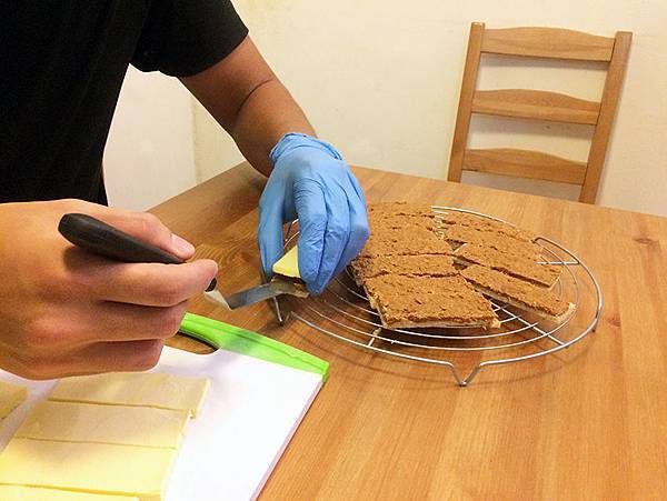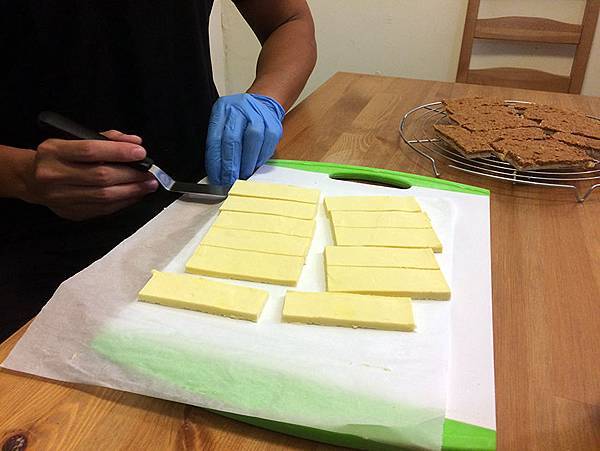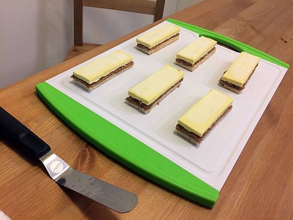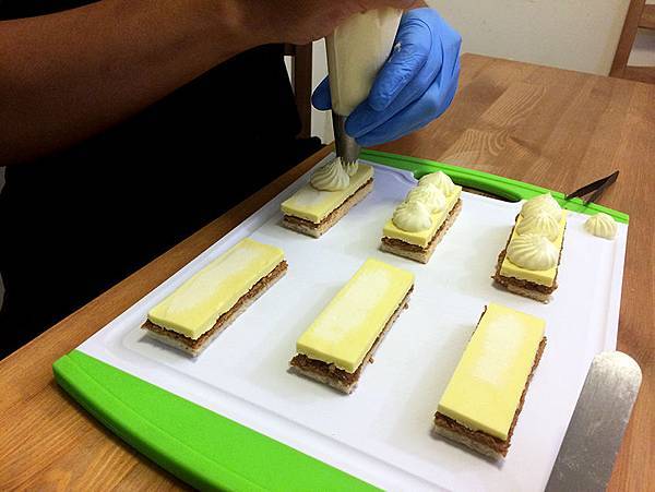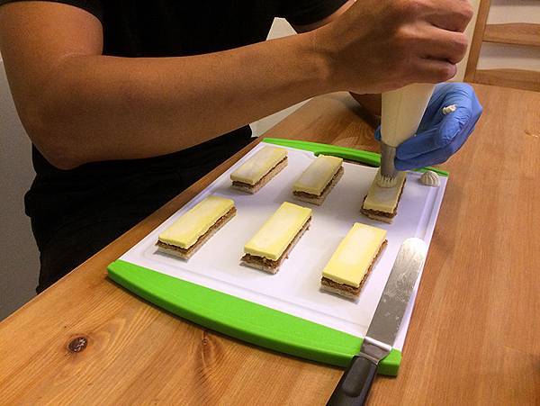 接著要疊上從冰箱拿出的片狀百香果餡。