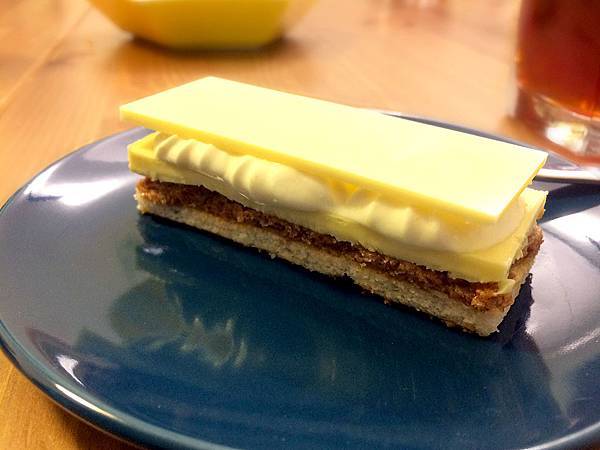 不過用叉子切上方較硬的白巧克力片容易把甜點弄塌不那麼優雅,