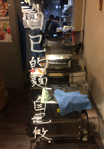 右邊玻璃上還寫著『自己的麵自己做。』,裡面那台就是製麵機囉!