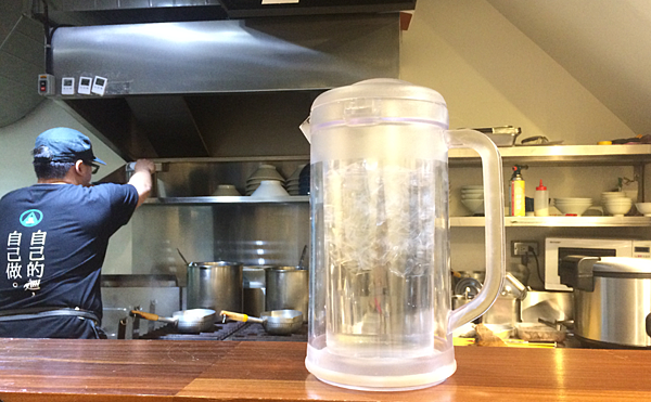 冰開水在吧台上可自行取用,桌上無提供調味料,因店家相信拉麵已是最好的配置。
