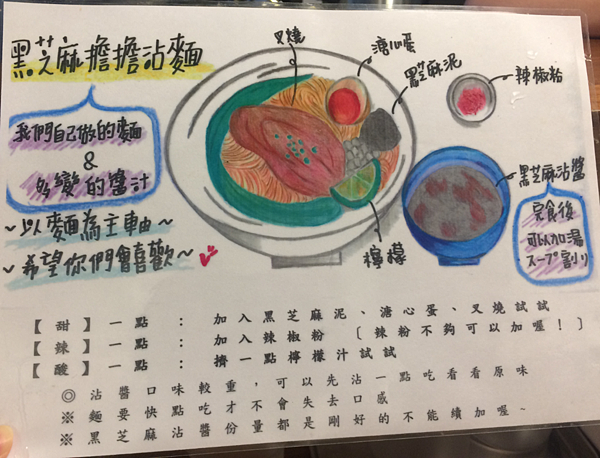 找不到男友拍的黑芝麻擔擔沾麵照片,就貼個店家提供的沾麵吃法示意圖吧~