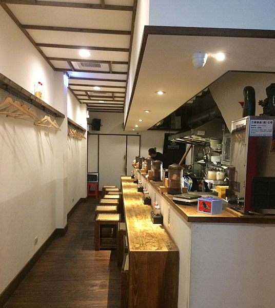 店面不大,十個吧檯位,後方有衣架可以掛外套包包,後背包掛上後覺得走道有些擠就是了。