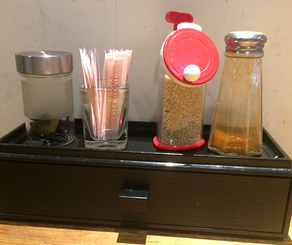 筷盒上的調味料有白芝麻跟七味粉,左邊的罐子裡是髮圈供留長髮的人使用還滿貼心的。