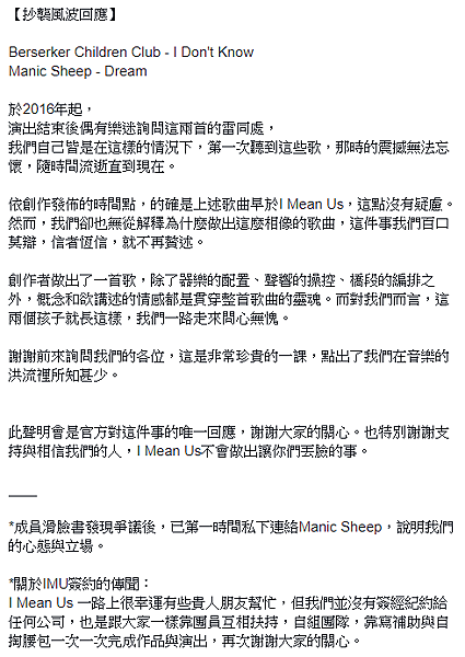 再來看看IMU於9/16日親上火線,在官方FB發了公開聲明: